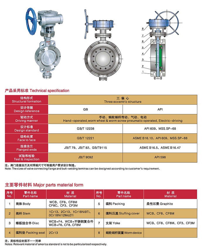 三偏心蝶閥,被廣泛用于介質溫度≤425℃的冶金 、電力、石油化工、以及給排水和市政建設等工業管道上,作調節流量和載斷流體使用。其主要特點有耐高溫、必須使用硬密封、但泄漏量大;要零泄漏、必須使用軟密封、卻不耐高溫。為克服雙偏心蝶閥這一矛盾、又對蝶閥進行了第三次偏心。而所謂第三次偏心,就是密封副的形狀不是正錐,而是斜錐。