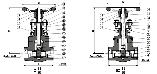 Z61H/Y、HZ61H/Y、HZ11H/Y型鍛鋼內螺紋、承插焊閘閥 主要連接尺寸及重量