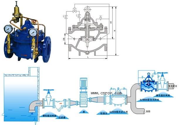 該閥用于生活供水和消防供水并聯(lián)供水系統(tǒng)中,正常情況供生活用水,當(dāng)火災(zāi)發(fā)生時(shí)消防用水時(shí),閥門自動(dòng)關(guān)閉生活用水,確保足夠的消防用水。當(dāng)消防停止用水時(shí)壓力減少,閥門自動(dòng)恢復(fù)生活用水,該閥使系統(tǒng)無(wú)須另設(shè)專門的消防單獨(dú)供水管網(wǎng),大大地節(jié)省了工程建設(shè)成本和日常的用水量。該閥控制靈敏、安全可靠、調(diào)試簡(jiǎn)單、使用壽命長(zhǎng)。